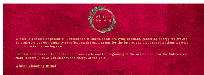 *Winter Visioning Ceremony: Use this ceremony to reflect on the past and begin planting seeds for the next cycle.